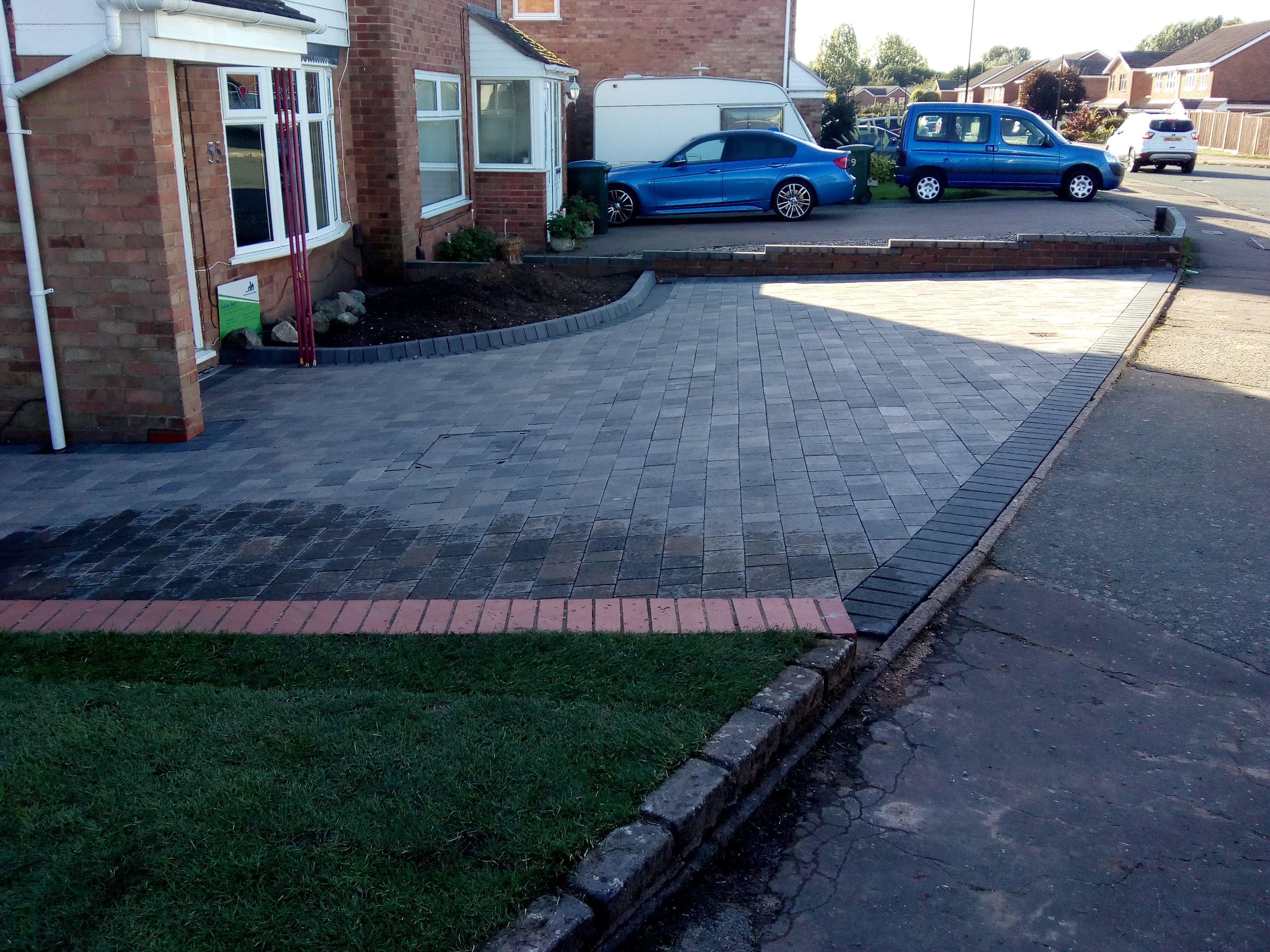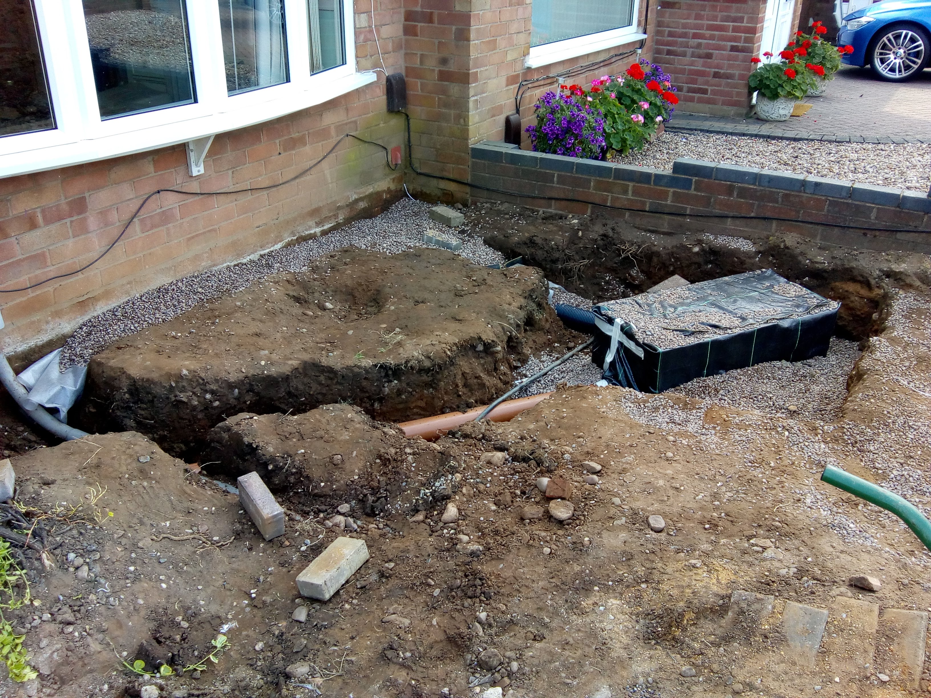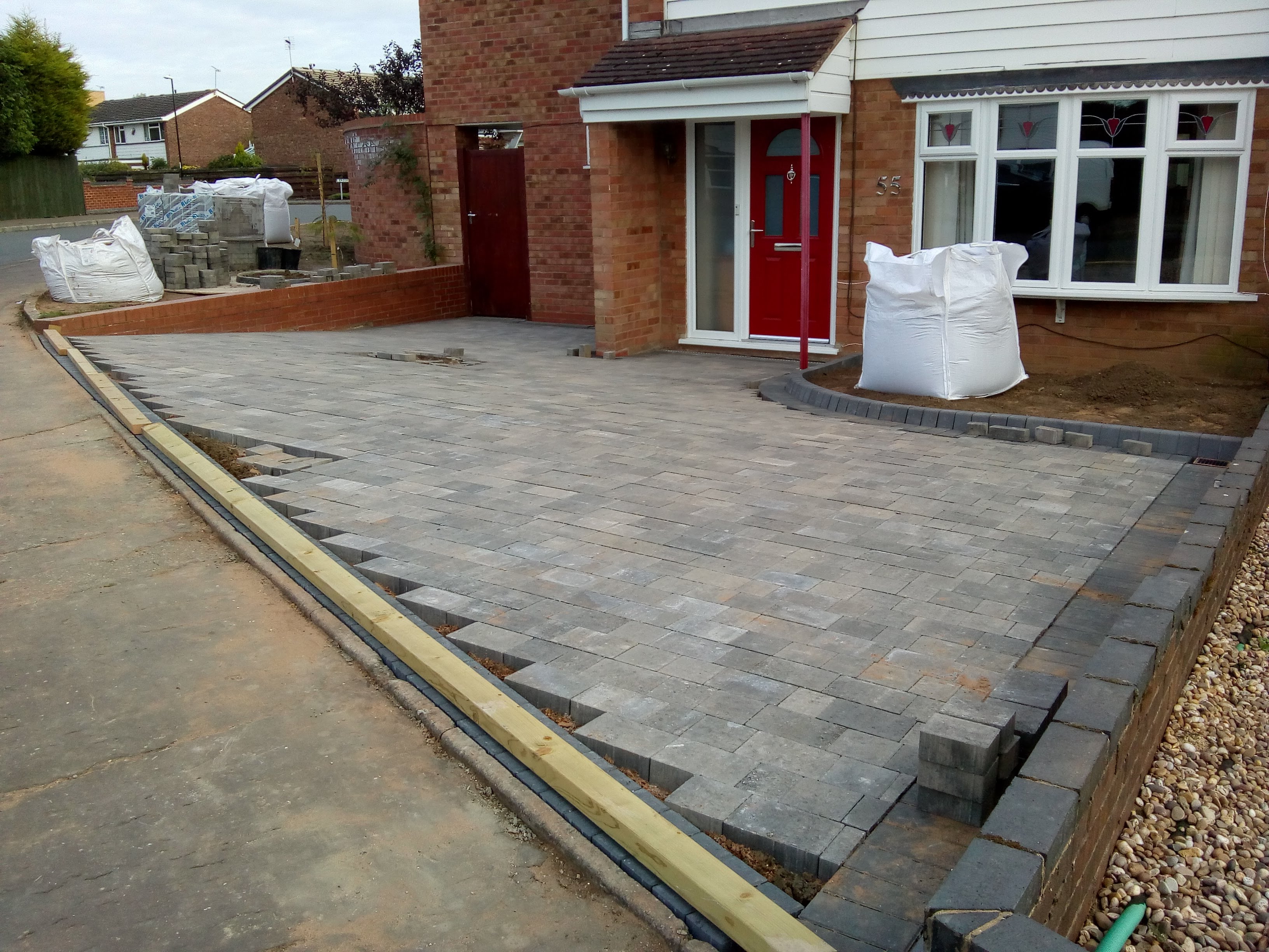From Excavation to installing soakaways and installing new block paving including new lawn.