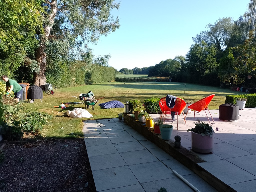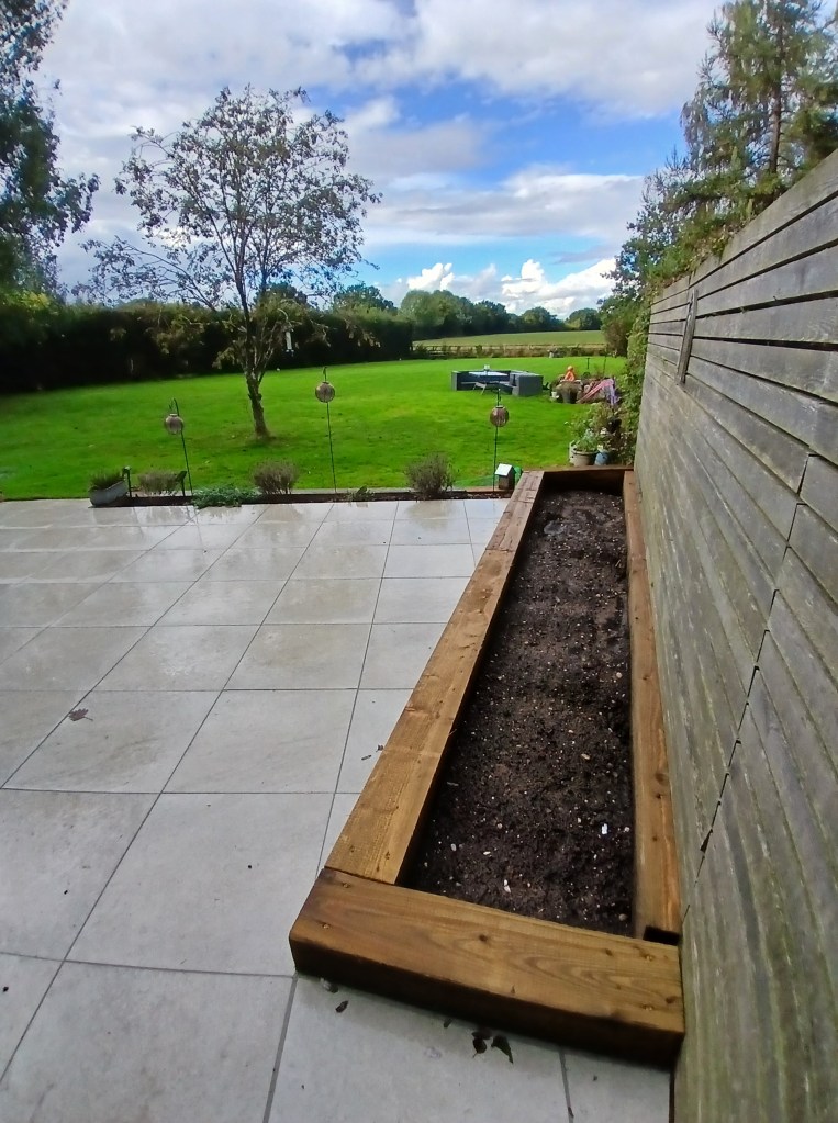 New fence erected with concrete base and fence posts. Patio construction with full drainage course and fresh turf laid.