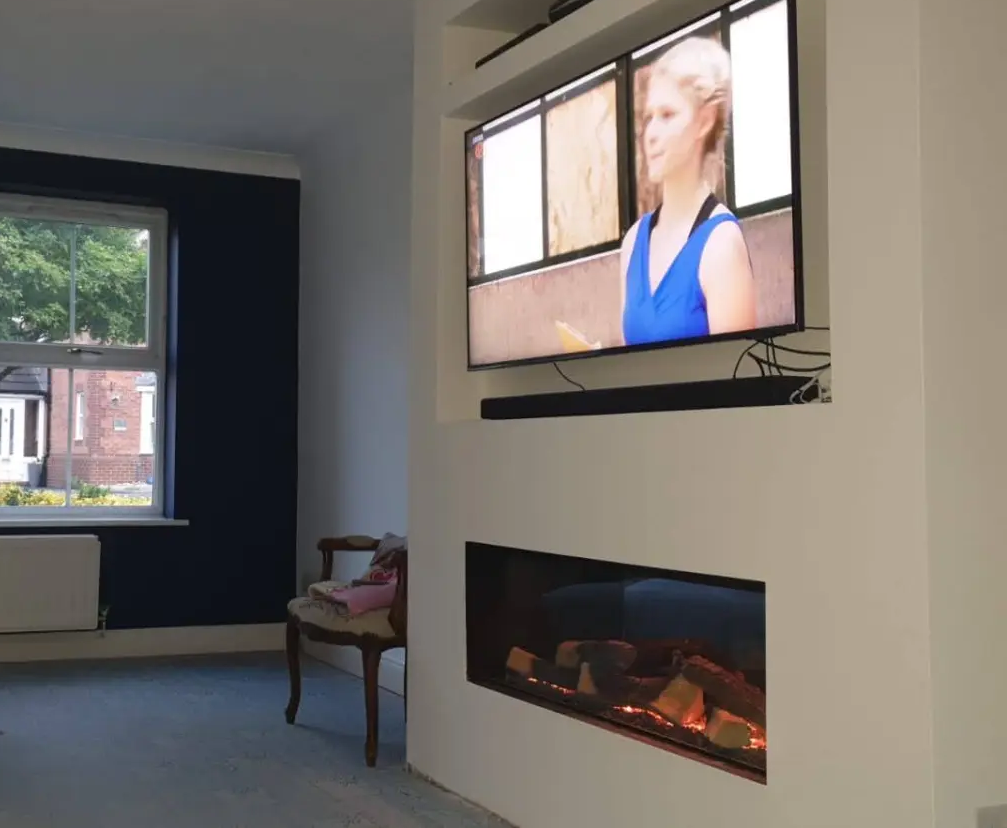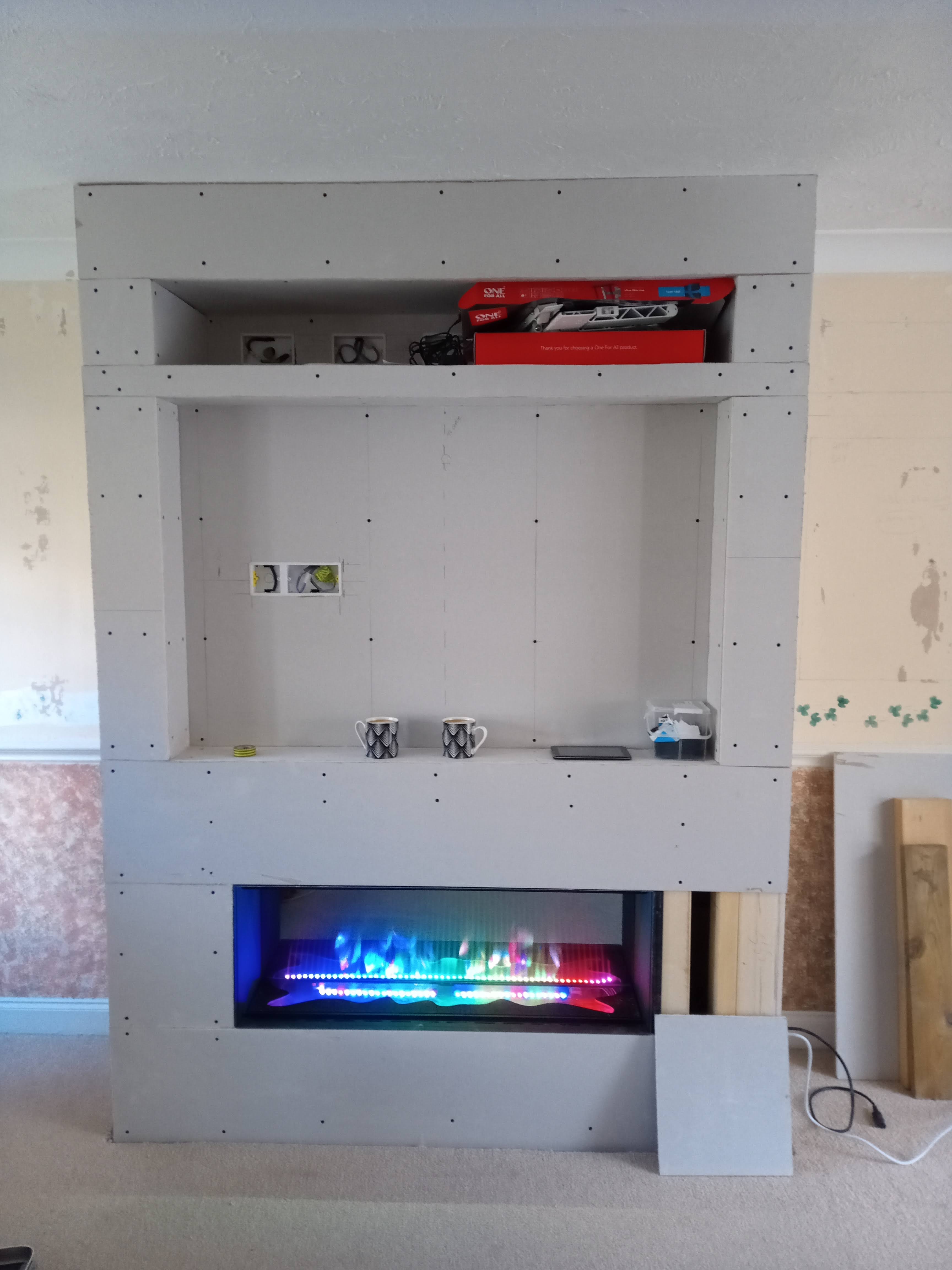 Job in Binley took on carpentery, plasterboarding and other skills to reconstruct old fireplace into a multimedia and fireplace.